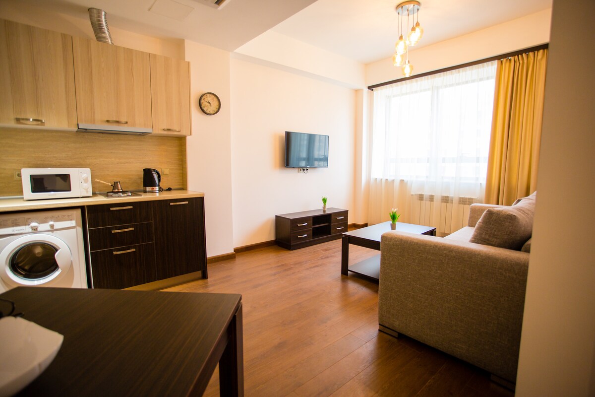 Located in the modern part of Yerevan these Studio apartments are ideal if you are travelling with family or friends. With its modern style, fully equipped kitchen and warm atmosphere its will give you a possibility to fully enjoy your trip in Yerevan. The strategic position will allow you to easily walk to all major points of tourist and historical interest that the city offers. Here you will also find many cafes and restaurants where you can taste the authentic Armenian lifestyle.