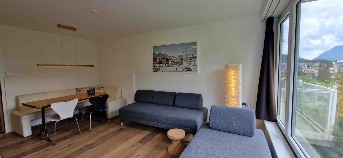 Stylish and quiet as well as very cozy studio apartment in a central location with a view. 4 min. walk to the valley station and the village square in the center. The apartment is 1750 meters above sea level Very easily accessible by train via Chur (1 hour) (5-minute walk from the train station). It is about a 3-minute walk to Obersee and Untersee (lake with beautiful wooden bathing area). Parking space available at the house on request. There is also a public parking lot and a parking garage nearby.