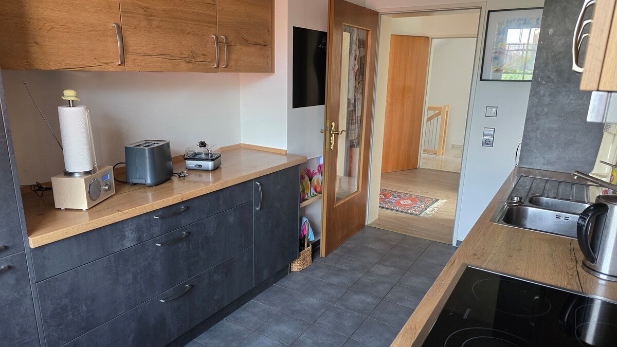 The guest apartment "Am Kirchplatz" is a cozily furnished apartment on the first floor with a separate entrance. On over 90 square meters of living space, we can accommodate up to 6 people. The large west terrace with grill, accessible from the living room, is available for your exclusive use. The family-friendly apartment is centrally located at the church (church bells according to Bavarian tradition) in beautiful Obertaufkirchen, but still quiet with views of the countryside.