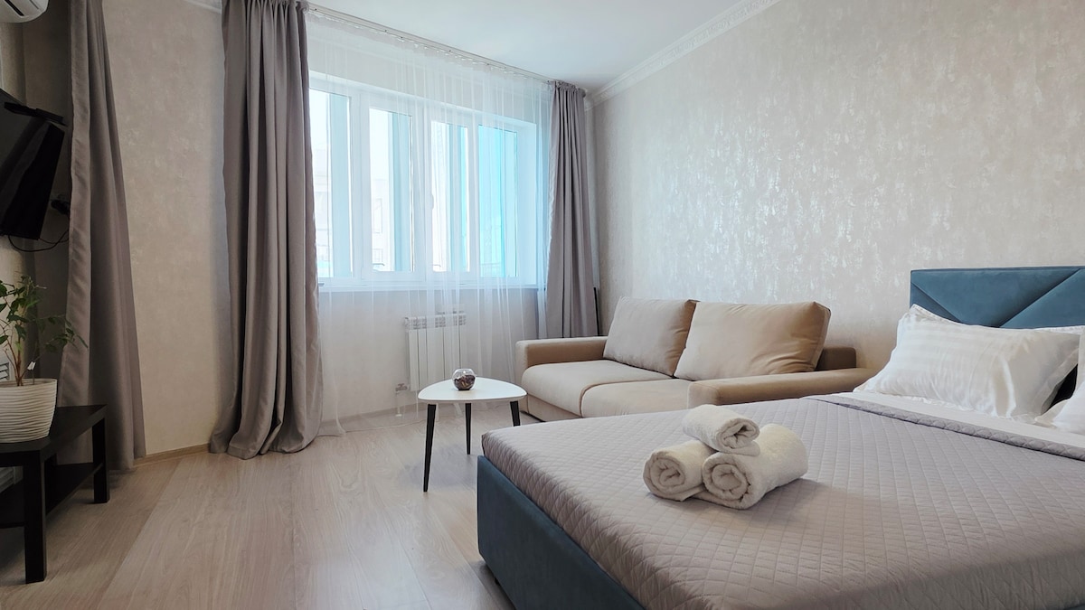Discover comfort in the heart of Astana! Welcome to your home away from home — a stylish, 1-BR apartment just minutes away from the city's main attractions. What you’ll love: • Comfortable bed with fresh linens • High-speed Wi-Fi and Smart TV • Fully equipped kitchen + dining area • Quiet surroundings — botanic garden and parks • Walking distance to shops and public transport • Easy access to Astana Arena Stadium, Barys Arena and other sport facilities. Book your stay and enjoy!