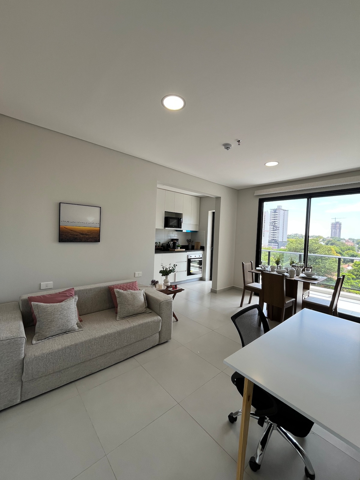 Modern apartment in the heart of Asunción, just 100 meters from the best shopping malls, restaurants, and hotels. Fully equipped, it features a bright living room, modern kitchen, bedroom with a queen-size bed, and a full bathroom. The building offers amazing amenities: gym, game room, semi-Olympic pool, and private parking. Perfect for those seeking comfort, luxury, and an unbeatable location. Book now and enjoy the best of Asunción!