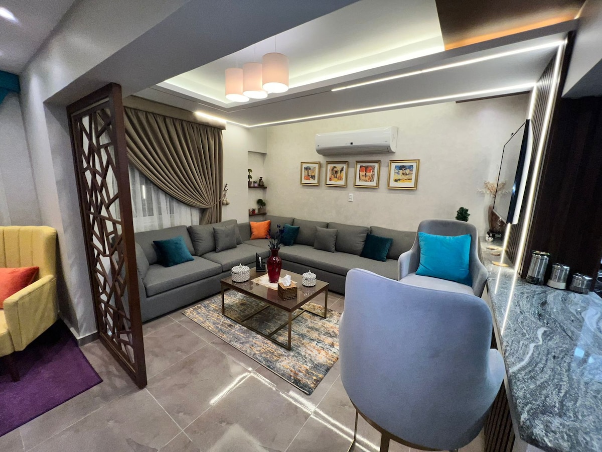 Experience the ultimate in modern comfort in our new 2-bedroom and 2-bathroom apartment suitable for 4 persons,Every inch of this stylish space is new and designed to make your stay unforgettable Our apartment is perfect for families or a business trip. You’ll find all the amenities you need, including a fully equipped kitchen, a comfortable living area Located in a prime compund, you’re just a short way from restaurants,shops in tagamoa and naser city Book now,,We can’t wait to host you!