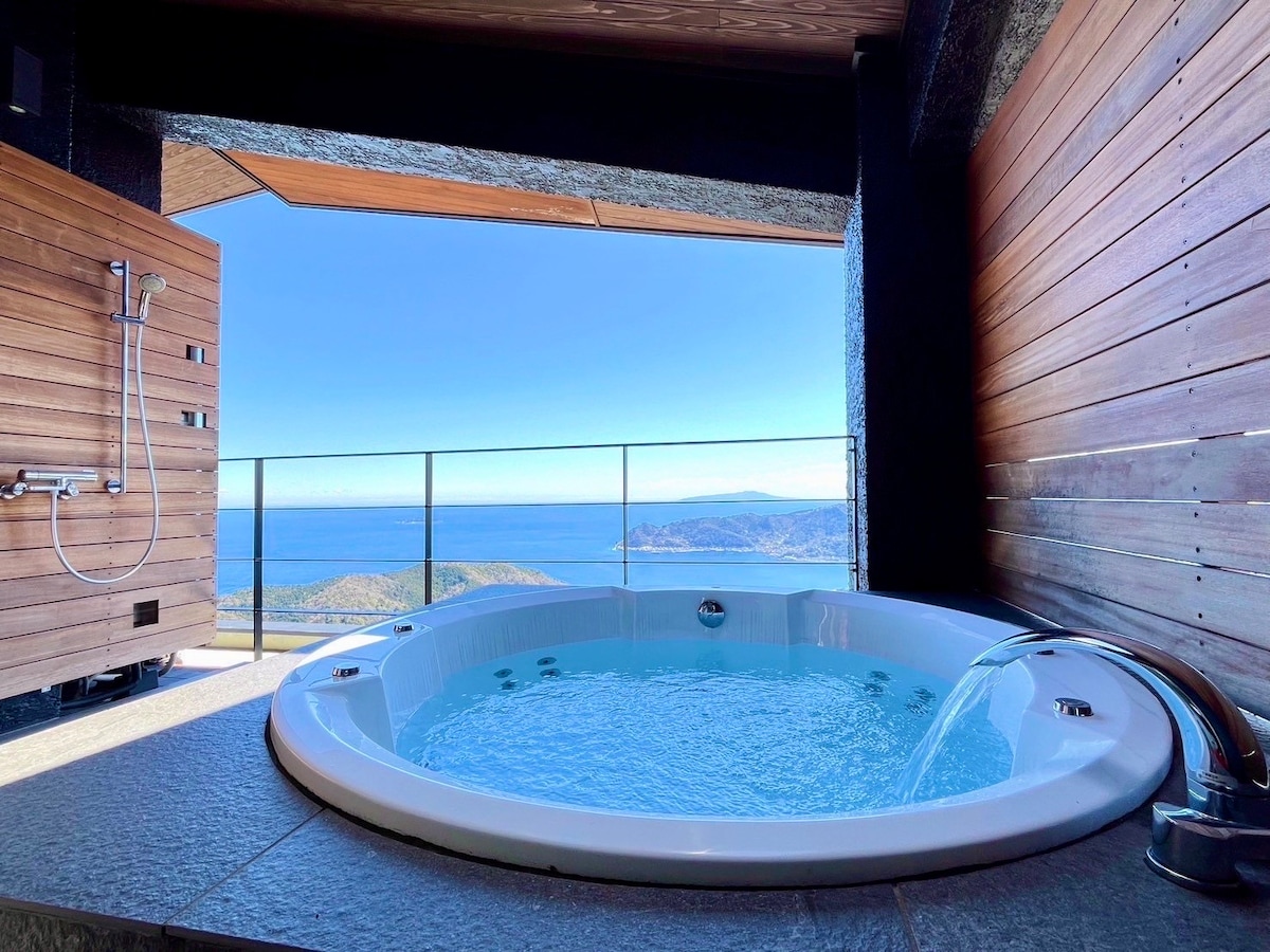 SUS Resort offers a luxurious setting with stunning ocean views and an elegant design dominated by white tones. the bath is fed by the natural hot springs of Ajiro Onsen, while outdoors, guests can enjoy a private heated pool and jacuzzi, offering a relaxing escape as you take in the sea breeze. The large windows provide breathtaking views of the ever-changing blue ocean and the beautiful nature of each season, creating a serene atmosphere where you can unwind and escape from daily life.