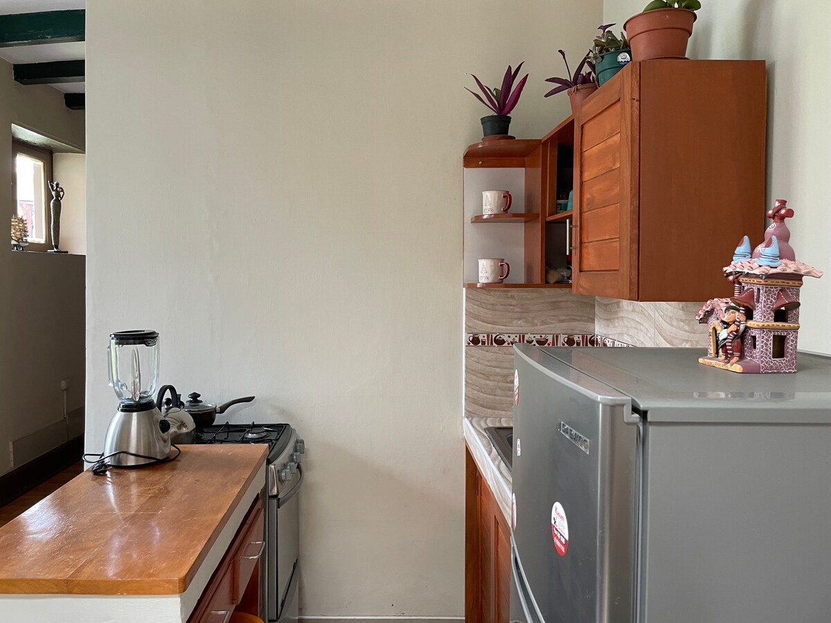 El Mini/departamento es confortable para 1 huésped, cama dos plazas/ matrimonial , amplio closet para estancias largas, un escritorio para trabajar y un televisor. Kitchenette con una cocina eléctrica de una hornilla, (COMIDA LIGHT) porque el ESPACIO ES PEQUEÑO Y CERRADO, una mesa abatible con 2 sillas, hervidor eléctrico, un frio- bar, licuadora personal, microondas, un mini grill y menaje. Un baño amplio con ducha eléctrica. El lugar seguro. Entrada independ. 2do. piso.