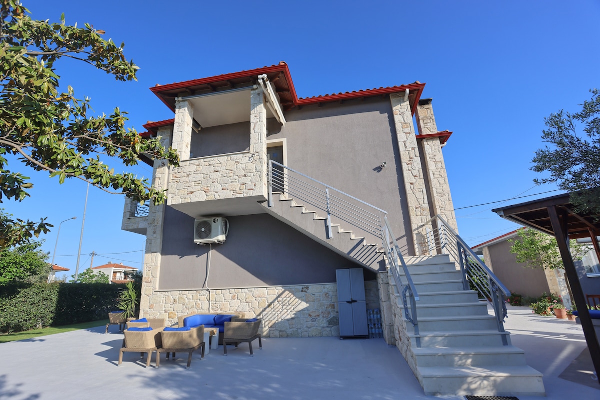 Villa ELEKTRA belongs to the Pleiades Boutique Villas complex, 5 elegant villas with a shared pool and wonderful views. Each 4-person villa is 65m2, with 2 bedrooms and 2 bathrooms (with shower). Fully equipped kitchen (microwave, espresso coffee maker, dishwasher, etc.), comfortable living room, outdoor furniture, BBQ, playground, garden, parking, air conditioning, wifi. It is a 10-minute walk from the beach, 10 minutes from the village of Kryopigi and 80 km from Thessaloniki airport.
