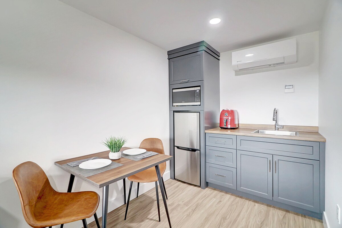 This modern, bright, and clean second-floor unit includes one comfortable queen bed with a full kitchenette. We aim to meet all your travel needs and have included a coffee maker, full fridge, air fryer, flat-screen TV, and air conditioning for your comfort. Located next to the Waterfront Pub and Eatery, with access to ATV and snowmobile trails. Ideal for the outdoor enthusiast, it is only minutes from the Nackawic waterfront for watersports and nature paths.