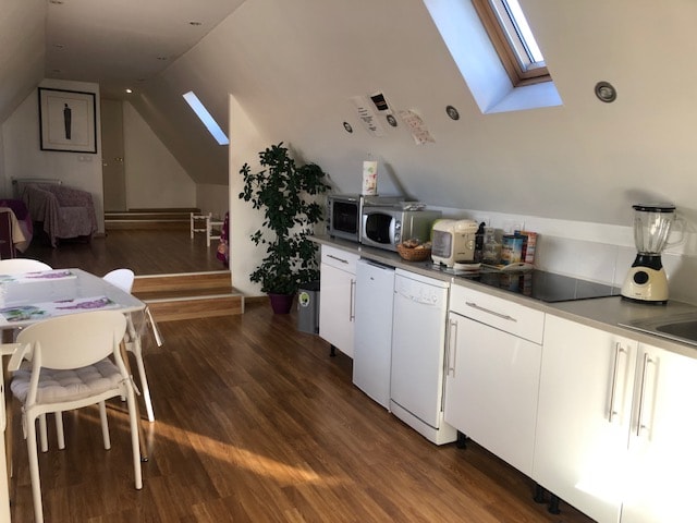 Appartement en duplex avec entrée privative meublé dans un style industriel Au rez de chaussée : pièce de vie avec canapé convertible confortable, un espace cuisine avec table à manger, une salle de douche avec WC Au 1er étage : chambre ouverte avec lit double ( ou 2 lits simples sur demande) Terrasse Parking privatif à proximité