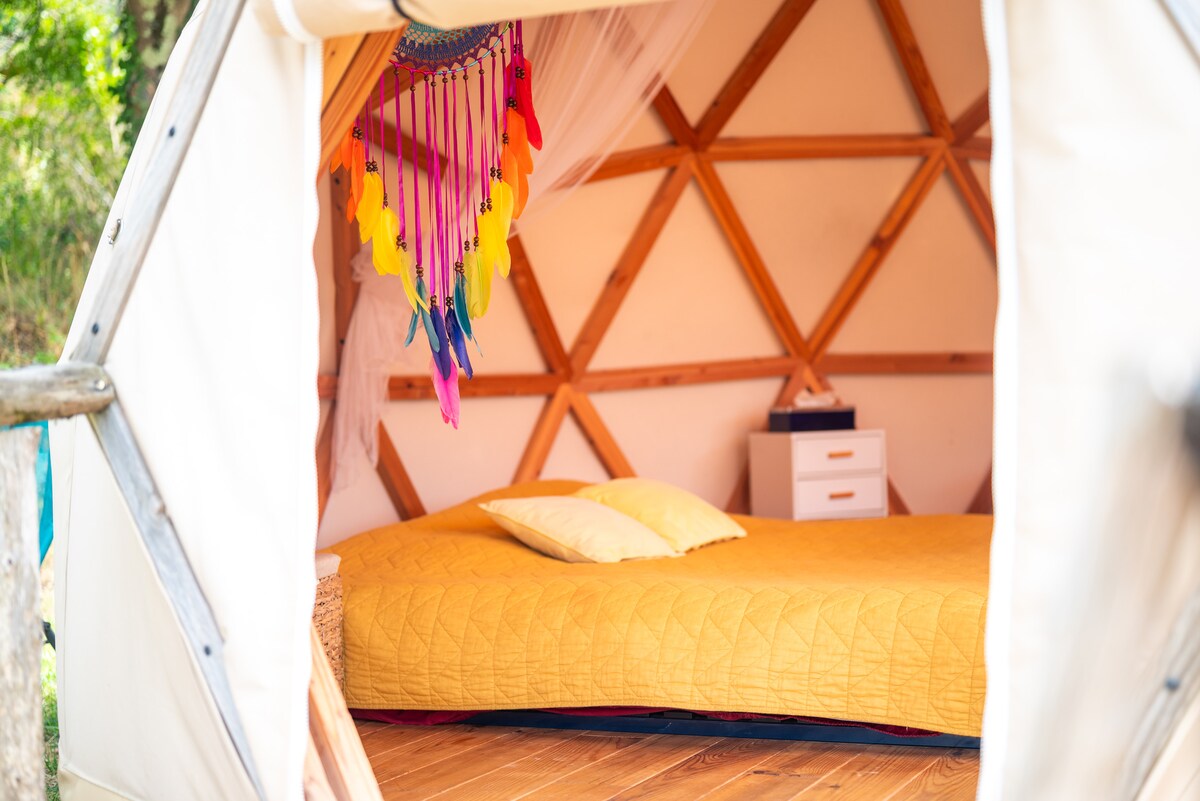 Unique accommodation, geodesic dome with king size round bed. A superb view of the plain. The interior of the dome is tastefully furnished and offers spacious interior for two people. the dome is ideal for a getaway or glamping experience. Enjoy starry nights from your comfortable bed and its soothing decoration. There is an on-site swimming pool, jacuzzi and bar/restaurant open from the end of April to September