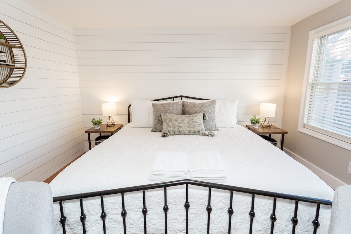 Stylish and swanky with high-design features and convenient central location - one block from downtown Harrisonburg. Detached garage-turned guesthouse. Walk to bars, restaurants, shopping and JMU. Brand new construction! Studio apartment with flat screen TV and streaming, Queen Bed, Futon, Wet Bar, Microwave Air-fryer Combo, Mini-fridge/freezer, Laundry, Tile shower.