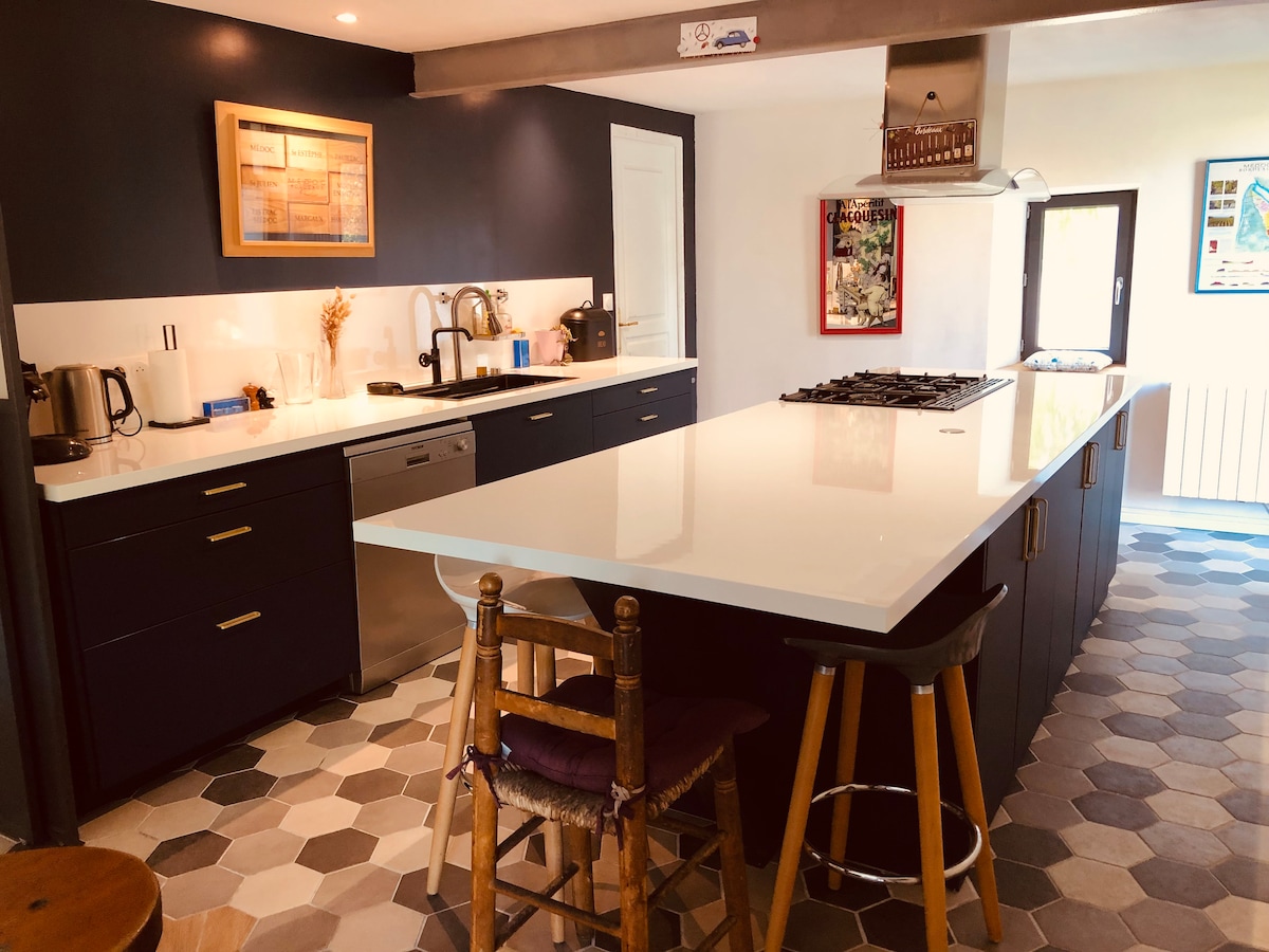 This accommodation can accommodate up to 13 people. You will be in a completely renovated old wine cellar. This place is great for family gatherings in the countryside. Located between the beaches of the Médoc Bleu, in the heart of the Médoc vineyards and at the gates of Bordeaux, you will be in the epicenter of many tourist activities. Our house will be perfect for a return from a walk or to simply spend a few days of rest with family.