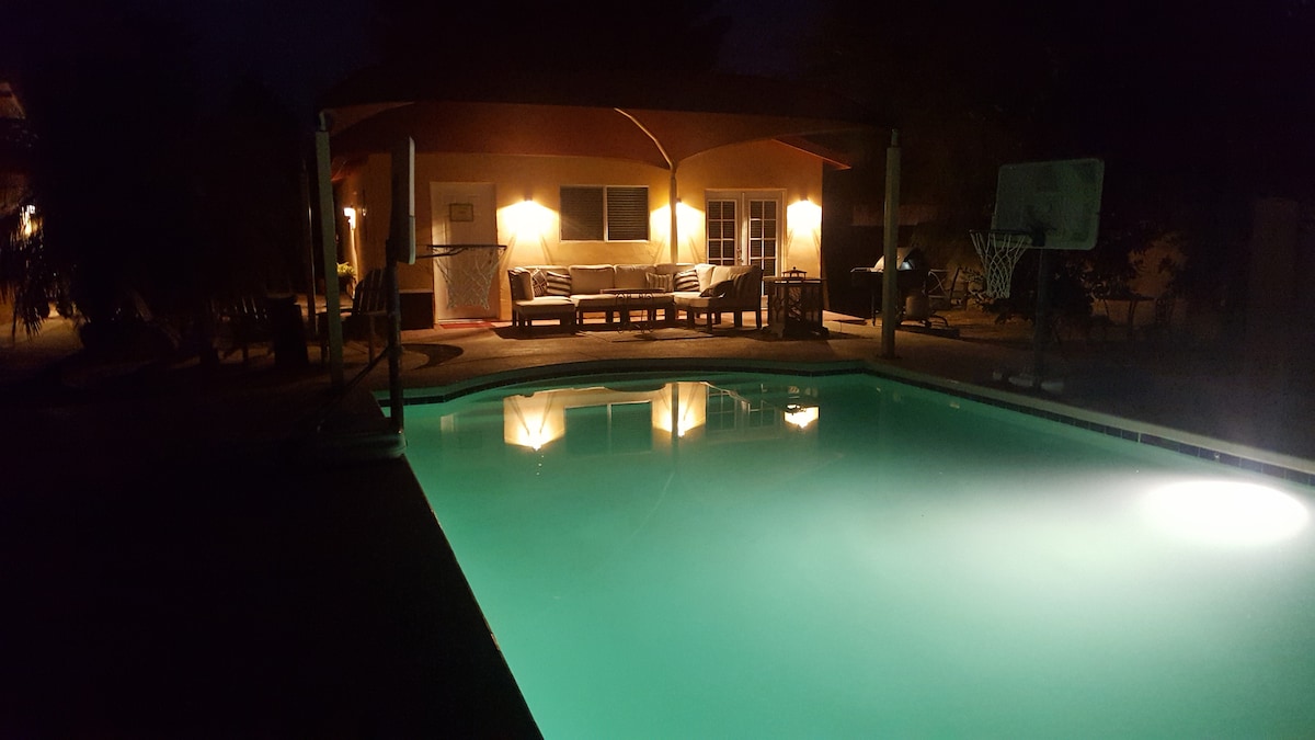 This unattached STUDIO POOL ROOM has one queen bed and a comfortable full futon. Features a large 8.5 ft private pool, citrus cocktail-corner, a large patio area, and RV parking. A diverse welcoming, large lot community with a farm-living environment so be prepared for roosters crowing, the occasional neighbor on horseback, and the sightings of small farm animals. In 5 miles or less you'll find SPRING TRAINING, NFL STADIUM, GOLF, MAJOR OUTLET SHOPS, RESTAURANTS, and MOVIE THEATERS.