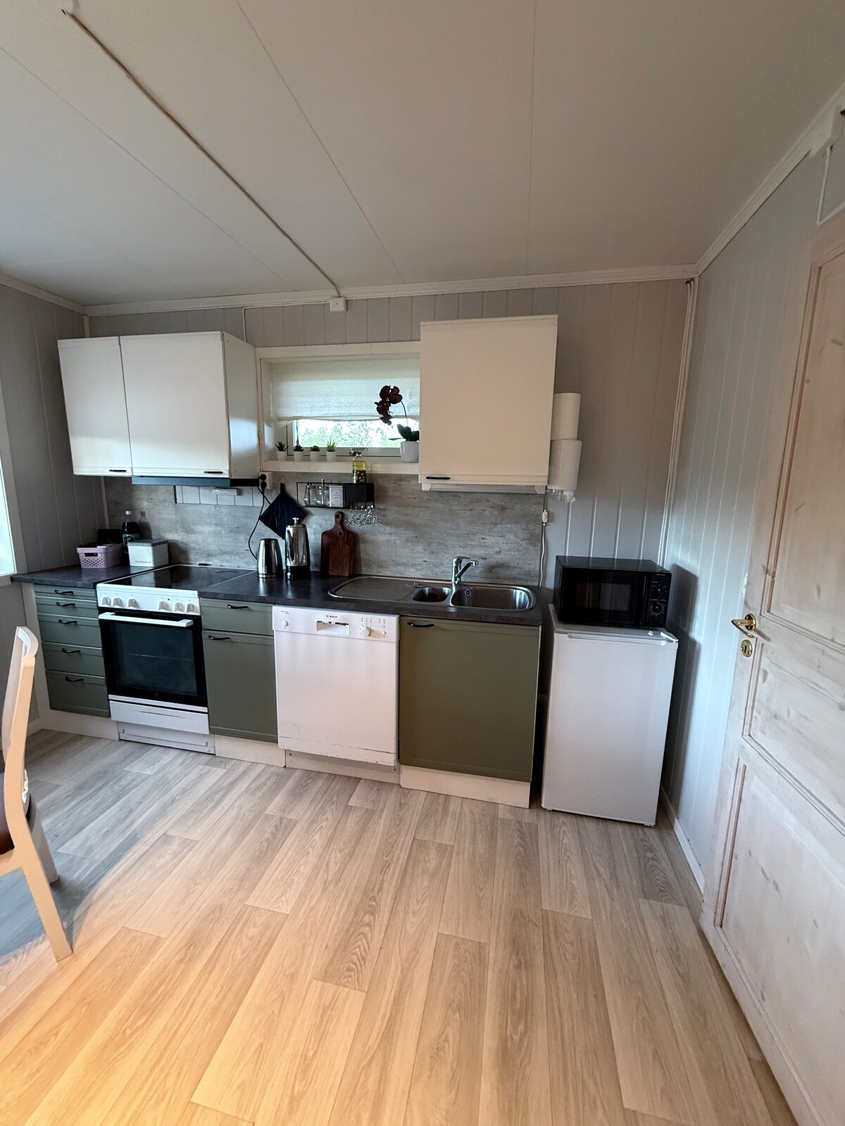 Relax with the whole family at this peaceful residence. Space for 2 adults and 2 children. Private bathroom/toilet/shower. Washing machine, fridge, microwave and stove. 1 bedroom with 2 beds. Sofa bed with mattress topper in the living room. Free internet and TV. Heated flat under the carport. Private entrance. Fishing opportunities right outside. The host lives on the upper floor. Key box with code at the front door