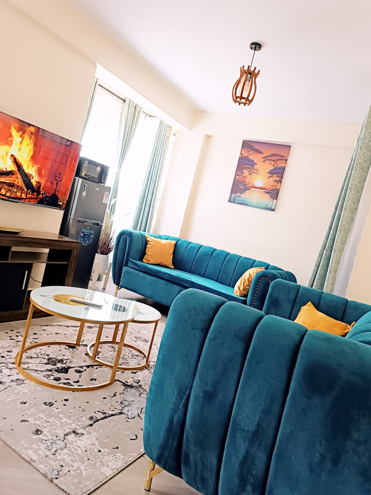 A comfortably arranged living area features two plush green sofas and a modern coffee table. A wall-mounted television displays a calming fireplace scene. Bright natural light filters through sheer curtains, illuminating the light-colored floor and a decorative plant positioned beside the television.