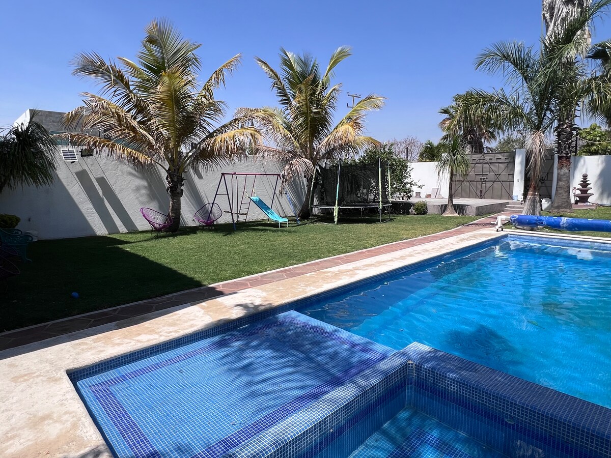 40 minutes from the city of Puebla and 15 minutes from Atlixco, in a 1,220 m2 space with a variety of trees and plants, you will find a comfortable and cozy house with Mediterranean-influenced architecture, Mexican handicraft details and antique objects. Terrace at the foot of the pool with barbecue, a viewpoint on the top floor, solar-heated swimming lane, large palapa surrounded by a sandbox with children's games and another small palapa with walkways over a pond with fish.