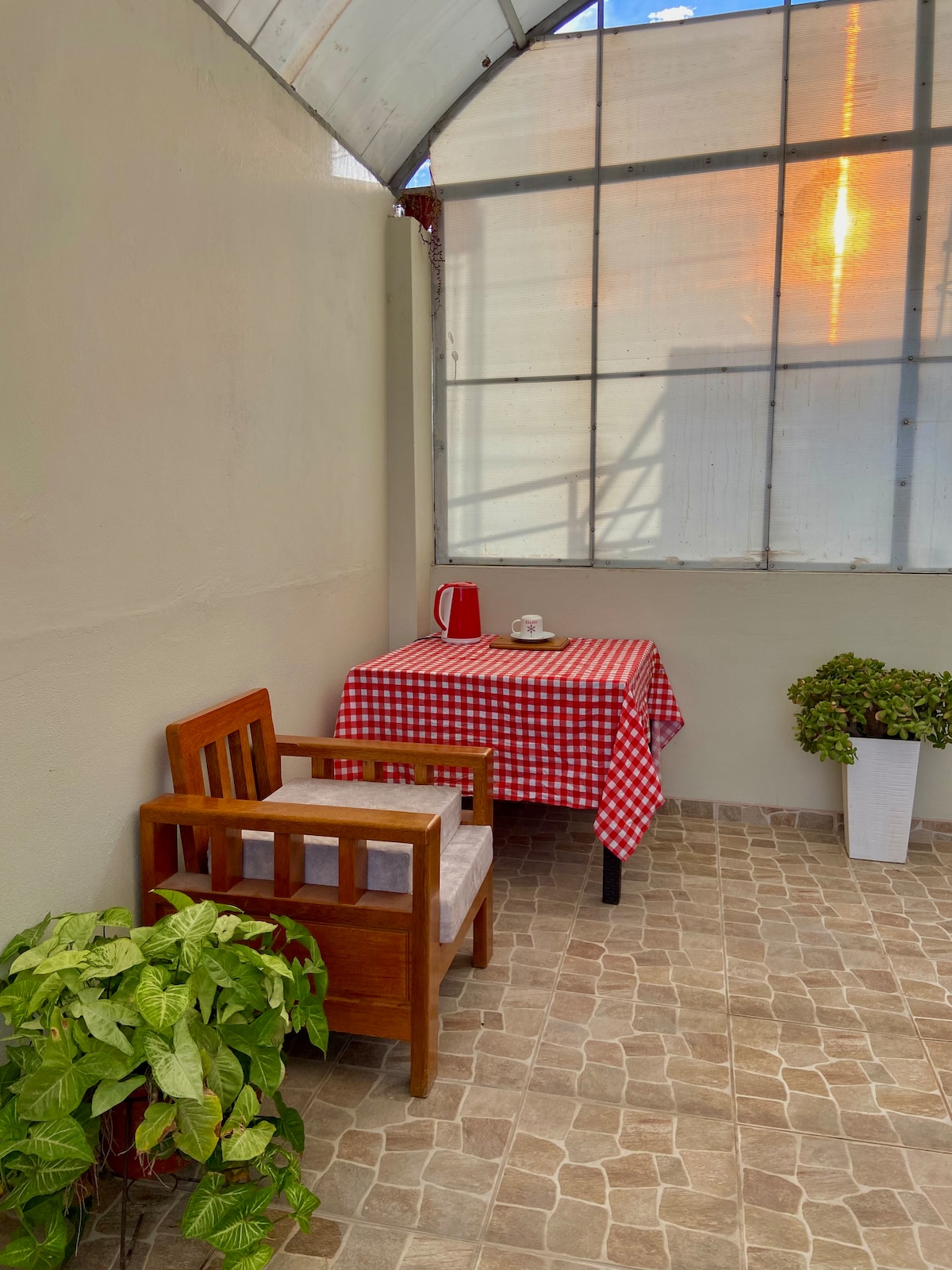 Minidepa tipo estudio con una cama cómoda, cocina/comedor propio, baño privado con agua caliente y zona de trabajo. El estudio es iluminado y ventilado, da a un patio terraza donde puedes sentarte a leer, comer, tomar o simplemente disfrutar de la vista a la ciudad y ver las estrellas. Es un espacio íntimo para una o dos personas con todas las comodidades. Se puede aparcar fuera del hospedaje (es una calle tranquila). Como anfitriones estaremos siempre pendientes de su estadía con nosotros.