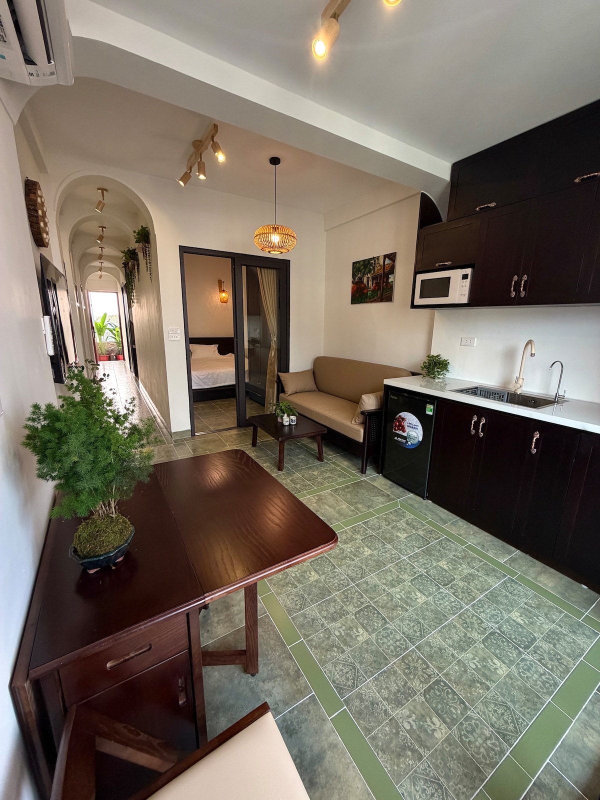 You'll experience an Indochine-style living space with the traditional charm of old Hanoi houses, near Ngũ Xã Island and Trúc Bạch Lake. From the window, admire Châu Long Market, a traditional marketplace reflecting old Hanoi, and glimpse Trúc Bạch Lake and the ancient rooftops of Châu Long Street. A short walk brings you to West Lake, where you can find a cozy café to enjoy the sunset or sip a beer on the sidewalk. When in Hanoi, live like a local.