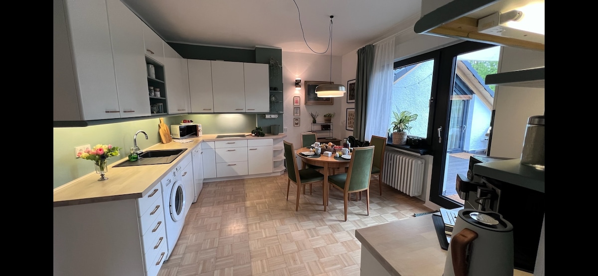The new apartment (including separate entrance) is in the heart of Essen's most beautiful district: Werden. It awaits you: A large, stylish kitchen-living room incl. dining table and cozy sofa in a sunny conservatory (view of the countryside). A spacious bedroom with a large double bed and built-in closet. A bright hallway and a stylish bathroom with rain shower/seat. In addition: new parquet/tiles, Wi-Fi, bed linens, towels, espresso machine and more. Walking distance to cafes, restaurants, Lake Baldeney 2 min.