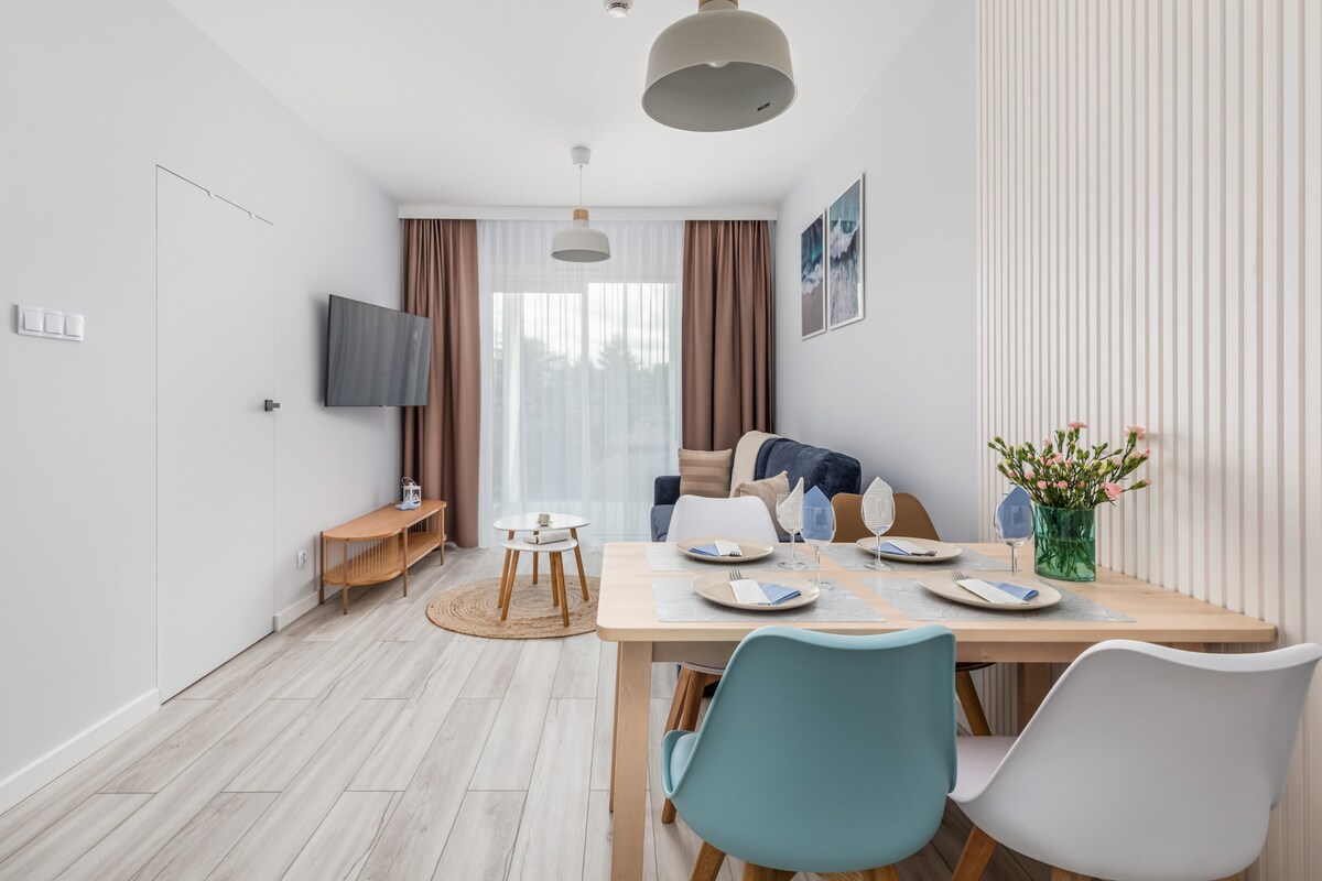 Apartament jest przestronny, urządzony w jasnych, przytulnych tonach, nawiązujących do nadmorskiego klimatu. Na gości czeka dobrze wyposażony aneks kuchenny, idealny do przygotowywania posiłków, strefa wypoczynkowa oraz balkon, na którym można wypić poranną kawę, podziwiając okolicę. Dodatkowo w obiekcie dostępne są udogodnienia, takie jak miejsce parkingowe i bezpłatne Wi-Fi, które sprawiają, że pobyt jest wygodny zarówno dla rodzin z dziećmi, jak i par szukających romantycznego wypoczynku.