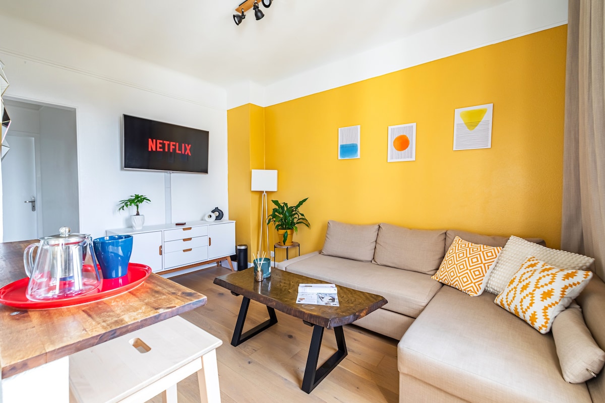 A 2 pas de Paris, bel appartement lumineux tout confort dans un quartier calme. Vous pouvez y séjourner jusqu'à 4 personnes. Il se compose d'une chambre ( literie de qualité), d'un salon (canapé convertible grand confort), d'une cuisine équipée. La salle de bains avec WC dispose d'un lave-linge et un grand dressing. Accès immédiat à Paris via RER, métro, bus, tramways et à vélos ( 2 en prêt sur demande). Tous commerces en proximité immédiate. Stationnement libre et borne de chargement.