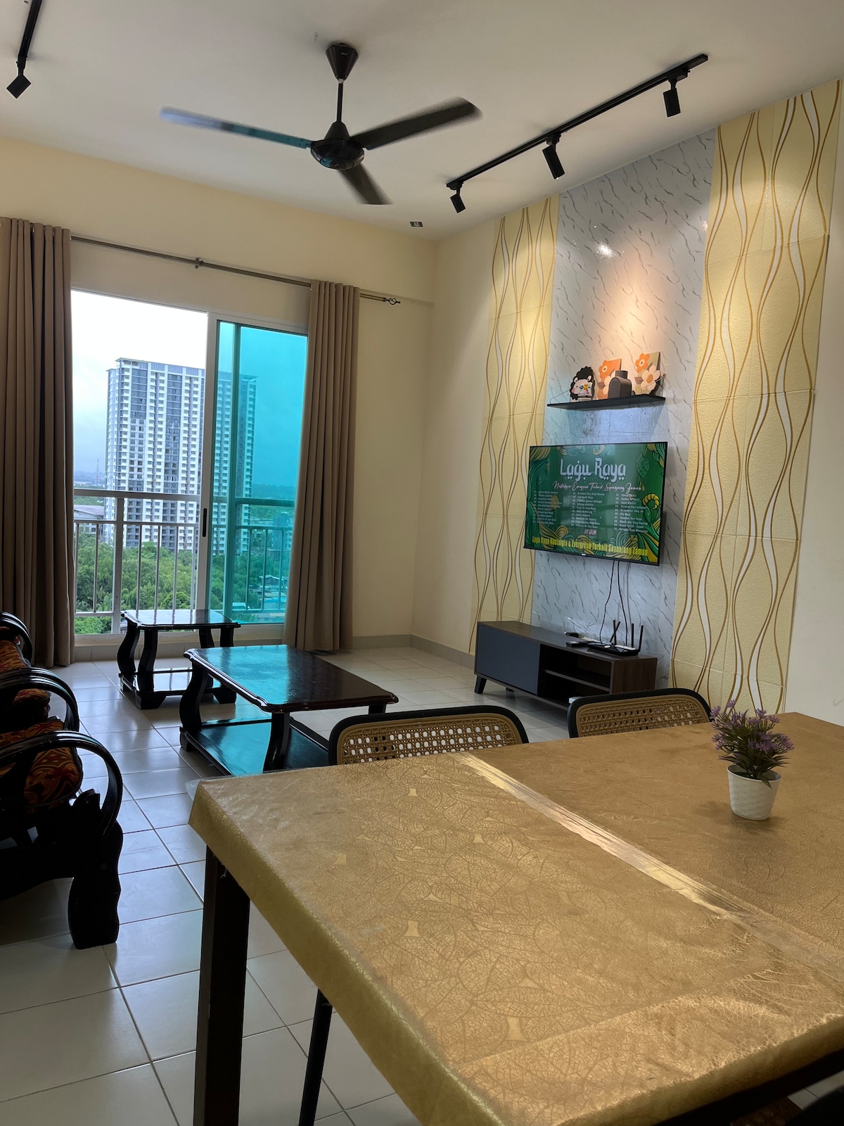 3 Room Apartment -Master room with attached bathroom, aircond & ceiling fan -Middle room with aircond & ceiling fan -Small room with aircond & ceiling fan Common area -Shared bathroom (with water heater) -Living room with tv( Astro Njoi) -Kitchen with Fridge, Microwave and basic cooking tools -Dining Area -Washing machine -Iron First floor nearer to staircase with lift. 1 Parking lot