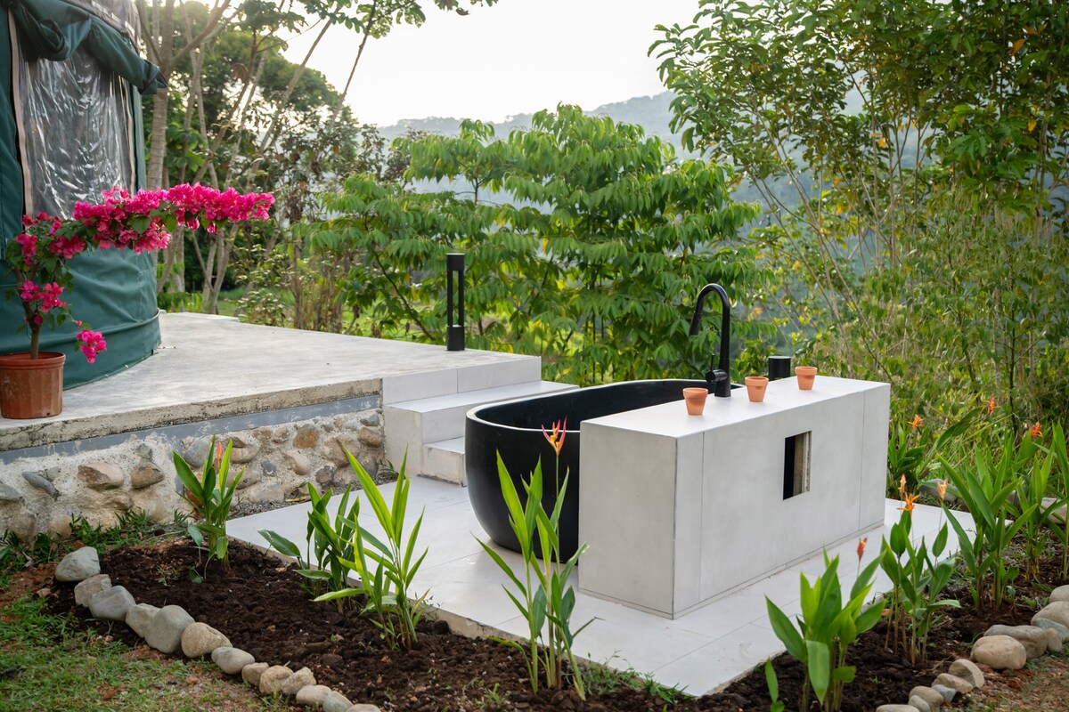 Disappear into 168 acres of pristine Costa Rican jungle with mountain panoramas, trails to your own private swimmable river, and a custom soaking tub perfectly positioned for stargazing. This architect-finished yurt is as close to off-grid magic as it gets, without sacrificing a single creature comfort. The water is piping hot from the solar heater, and the water comes directly from the springs on the property. Reconnect with nature at this unforgettable escape.