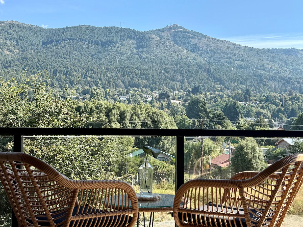 Relájate en este alojamiento único y tranquilo. Con increibles vistas al cerro Otto desde todos sus ambientes. Se encuentra en un barrio cerrado, rodeado de bosques, con pileta climatiza en excelentes condiciones durante todo el año (abierta de martes a domingos) Departamento con 1 dormitorio, con vista al balcon y cerro Otto. Baño con bañadera, excelente presión de agua, calefacccionado por loza radiante. Cocina frente a las hermosas vistas, desde una cocina completamente equipada.