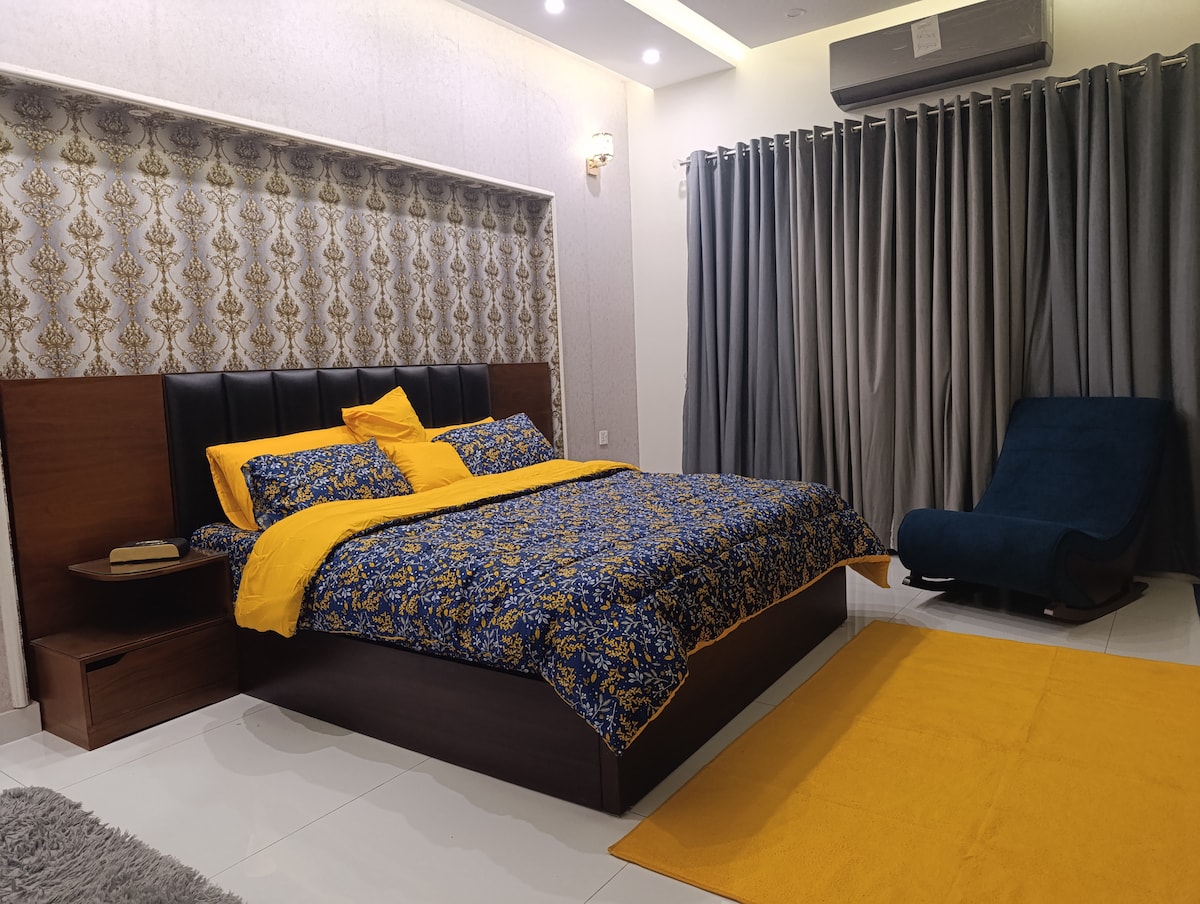 5 Bedrooms with 2 Separate Portions (1 3BHK & 1 2BHK+8 Seater Dinning Hall) is at A very accessable, peaceful & Convenient Location with a walking access to Large Markets, Hospital, Bahria Zoo, Bahria Trafalgar Square & Egyptian Monuments. Also Walking Distance to 2 Large family Parks. Free 2 indoor & 4 Outdoor Spacious Car Parking available. Interior is state of the Art with Customized Furniture Considering Guests Convenience & Ease. We Guarantee Your Stay with us will be Your finest Memory.