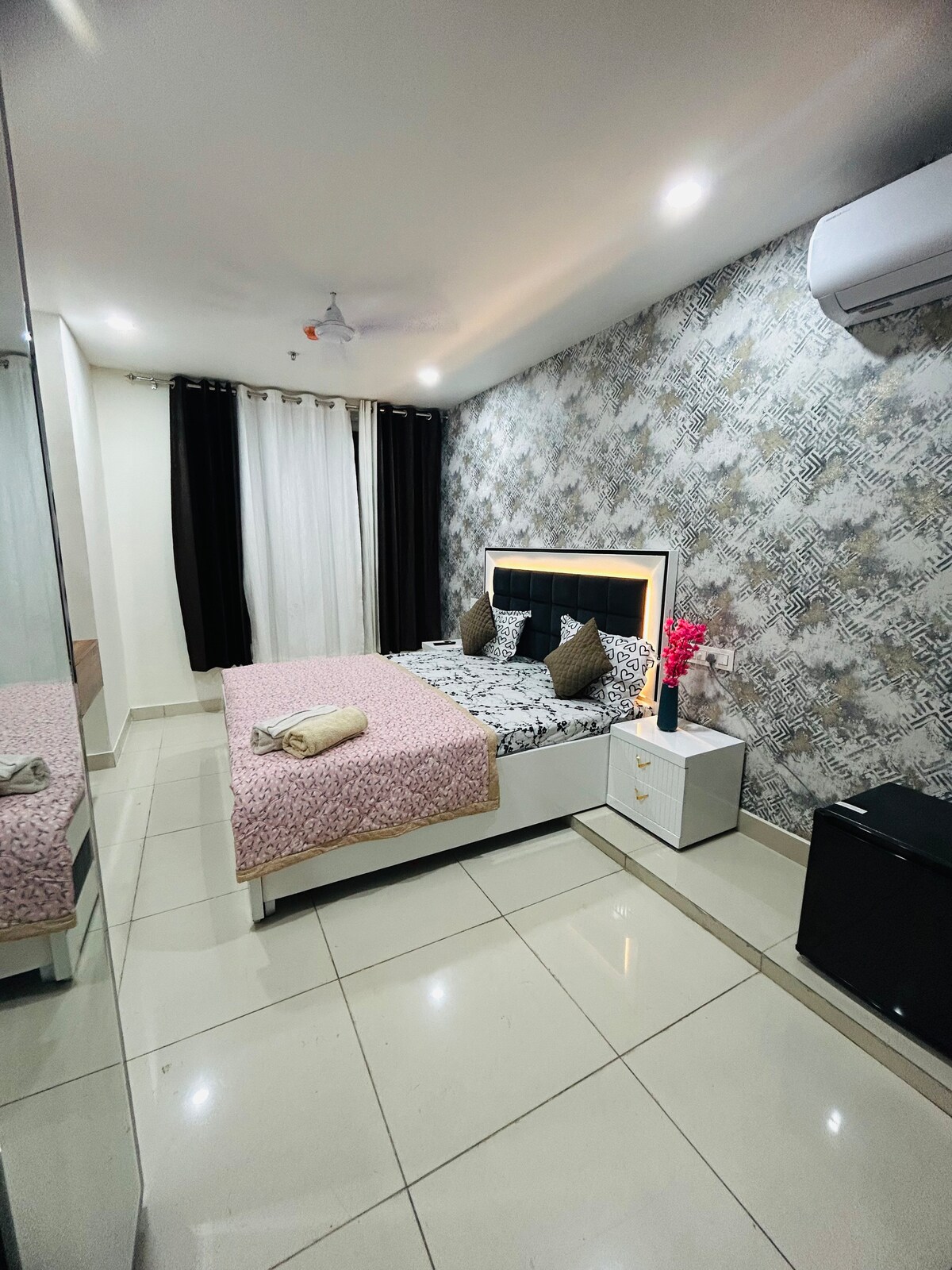 Modern 3BHK • Spacious Living Room • 3 Comfortable Bedrooms • Fully Equipped Kitchen • Clean, Modern Bathrooms ⭐ THE AMENITIES Guests get access to Swimming pool, gym , theatre , games , salon and more amenities are there like table tennis , badminton, virtual golf , carrom , pool table , foosball , air hockey 🗺️ LOCATION Located near the Chandigarh–Delhi highway, the property is: • 10–15 mins from Chandigarh Airport • Close to malls • Wedding guests attending functions in Tri-city