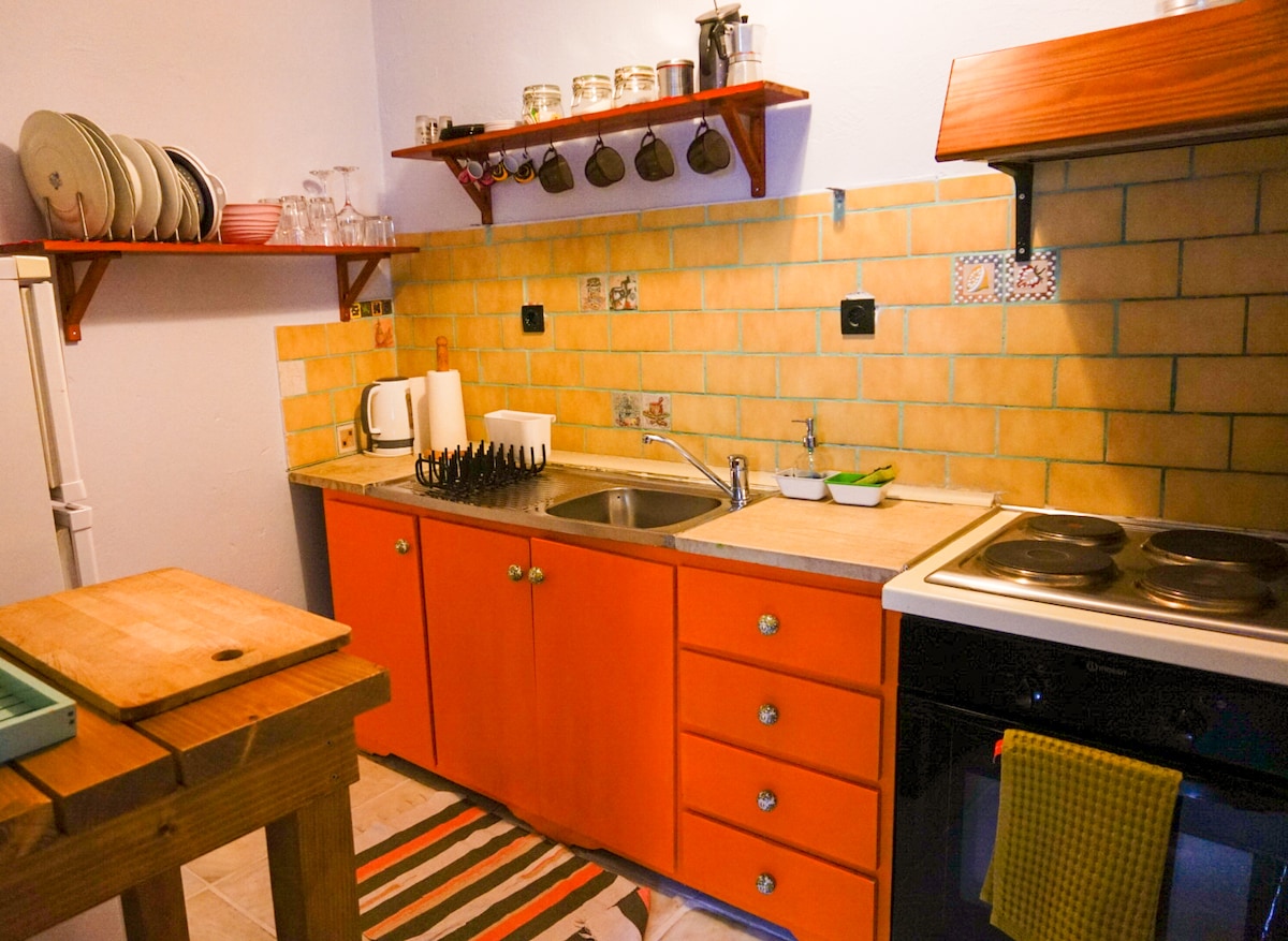An independent and traditional little house located in the center of Kalambaka, very close to Meteora — even within walking distance. It features a shared terrace where you can relax, one bedroom with a double bed (ideal for couples), a living room with a sofa and dining table, a fully equipped kitchen, and a bathroom with a shower and all the necessary amenities. A warm and tidy space where you can truly feel at home!