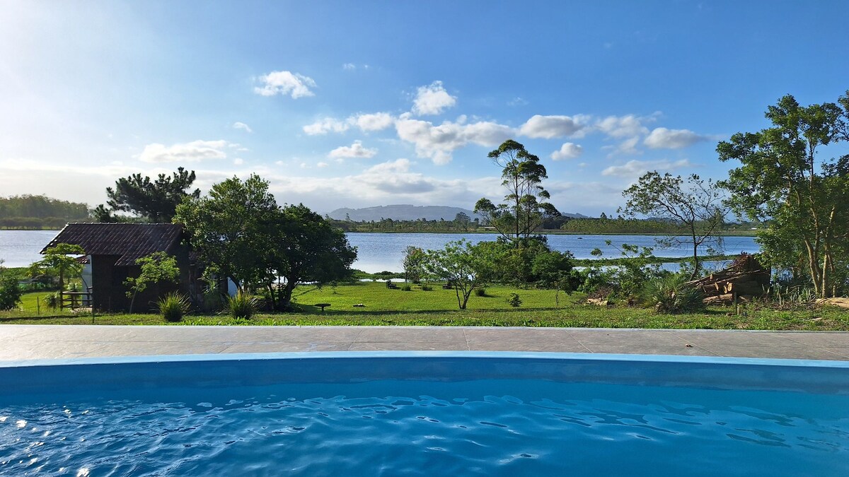 Take a break to relax in this country house with a pool overlooking the lagoon and located just a few kilometers from Balneário Gaivota beach. The house has access to the lagoon, which is suitable for sports such as canoeing, fishing, jetskiing, or just relaxing in contact with the water. The house has two bathrooms, one internal and one external.