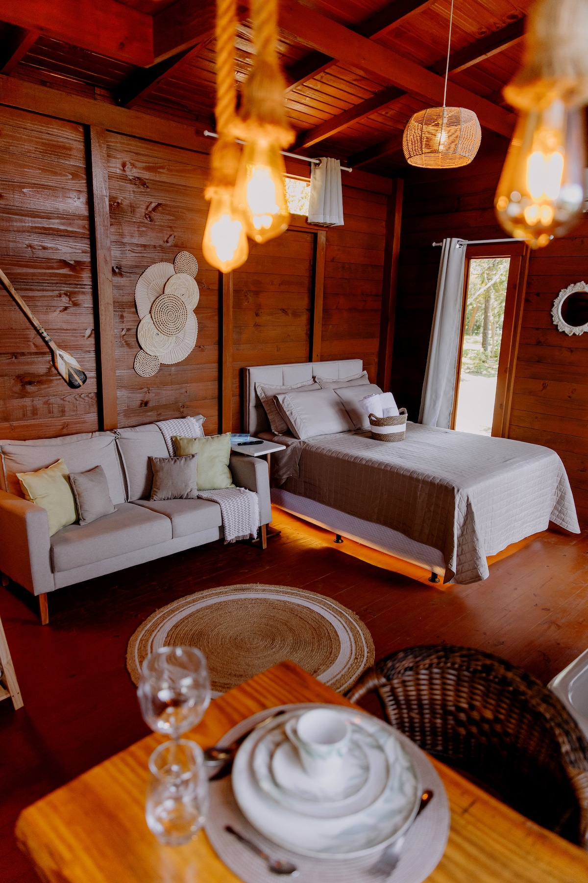 The lake chalet was built with those seeking tranquility, well-being, and connection with nature in mind, a place for you to escape the hectic routine of everyday life. Here, time slows down, and you will be able to observe nature, listen to the sounds of birds, and breathe fresh air. Our chalet is 48 square meters and has been carefully decorated. Important note: the chalet is private, everything in the photos is for the exclusive use of the guests.