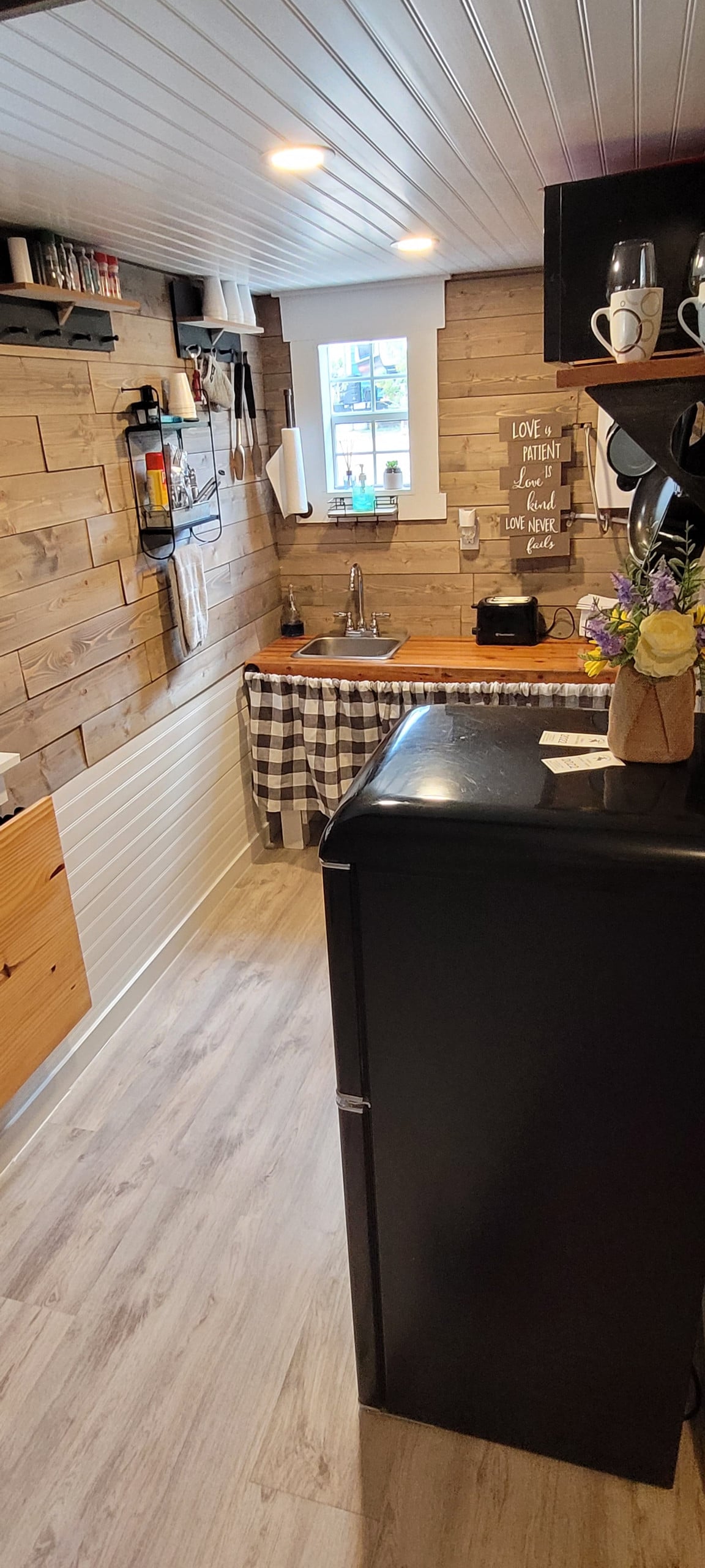 Get away from it all and not leave any comfort when you stay under the stars in this tiny home one of only 5 in this beautiful RV resort park. The park has swimming pool,picketball courts,convenience store, outdoor picnic area , river tubing , mini golf , BBQ pits . The home itsef has a full kitchen. living area has a pull out queen bed. The bathroom has a walk in shower . The bedroom is pretty spacious wt queen bed . Quiet Tiny home with all comforts .