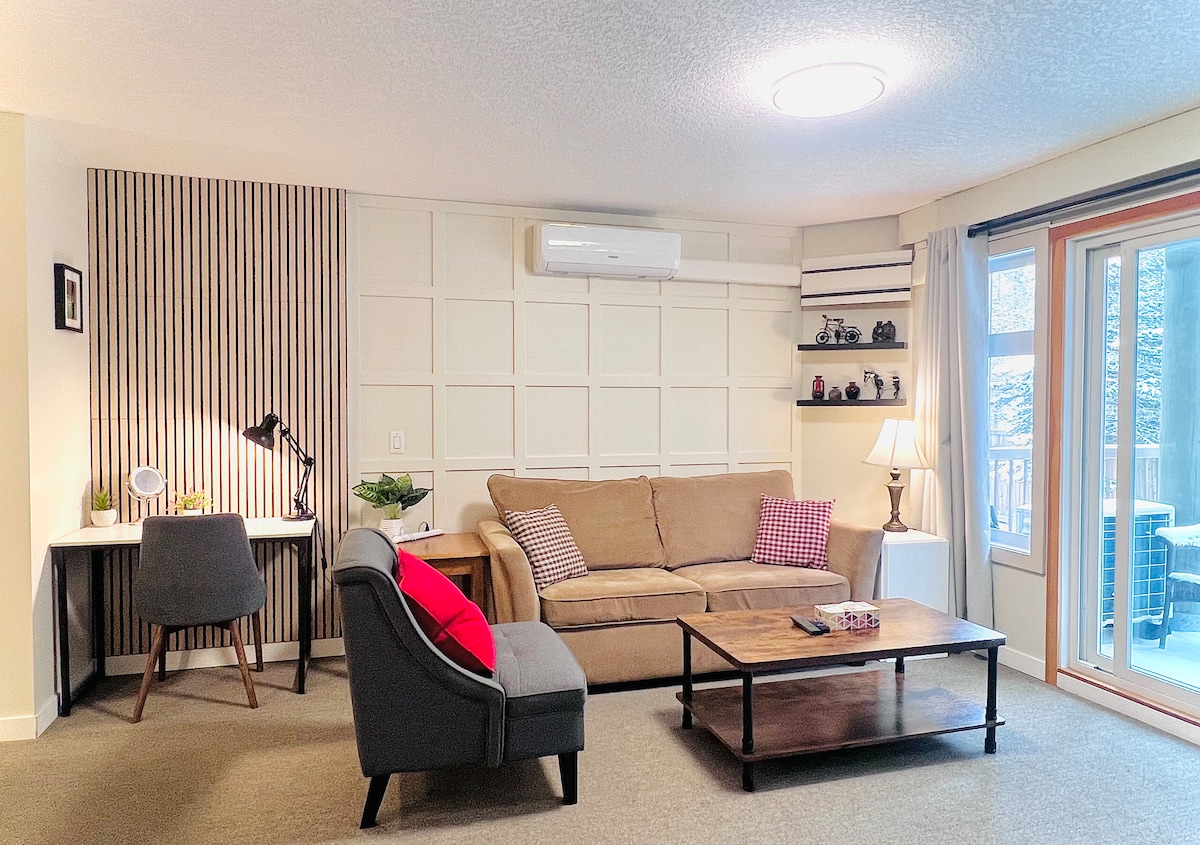 Blue Moose is a newly updated and furnished, spacious luxury one-bedroom condominium with king -sized bed and queen sofa bed. New for 2025: major bathroom and kitchen upgrades. PERFECT LOCATION This modern mountain retreat is situated next to a pristine mountain creek. Follow a creekside nature trail and within minutes you are in downtown Canmore with trendy shops, cafes, food trucks, and both casual and upscale dining.