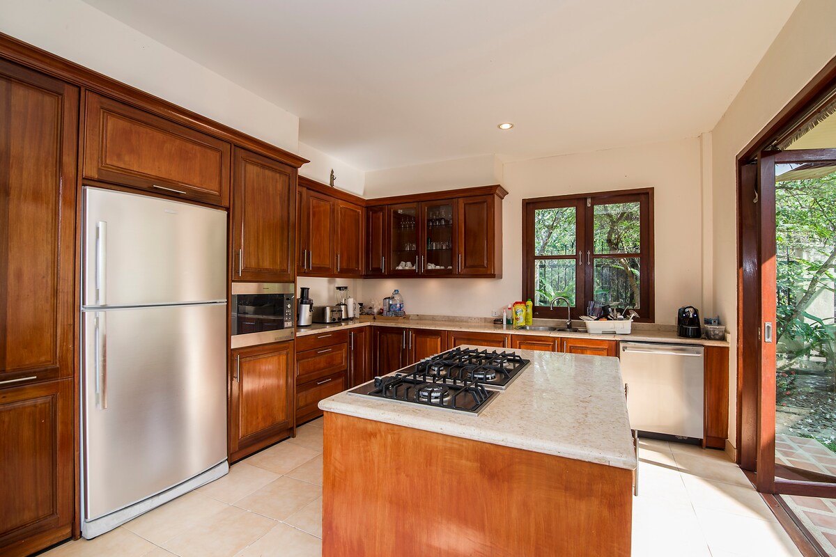 This lovely pool villa has a large open plan living-dining area. It has 3 bedrooms, 2 bathrooms and a fully-equipped kitchen. Electricity and water is included in the price. Airbnb’s Service Fee is also included. The kitchen and breakfast bar overlooks the garden and pool area which is a perfect space to enjoy your family vacation. You can relax on the beautiful veranda and cool down in the private pool with Jacuzzi. There is a bar/restaurant onsite with music, dart and pool table.
