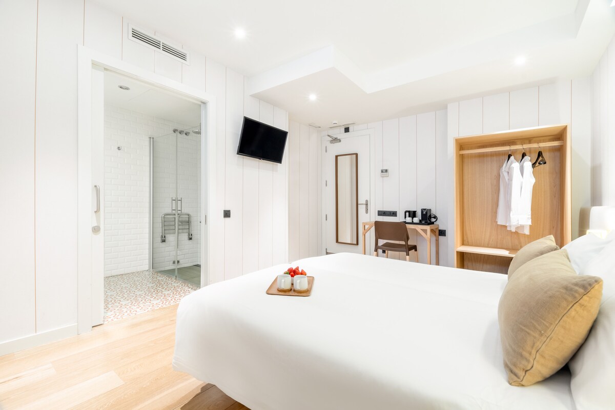 Casa Bella Gracia is a newly renovated boutique hotel located in the charismatic neighborhood of Gracia, in the center of Barcelona. It has 11 beautiful rooms, a large rooftop terrace and lockers to store your luggage. This room has a queen size bed or two single beds and private bathroom with shower, perfect for two people.