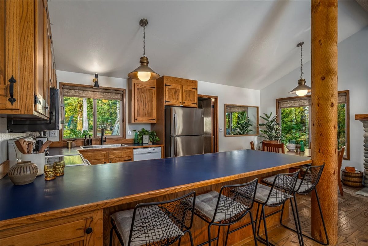 UPDATE: Backyard is limited to deck after loss of riverbank (See pictures). Everything else is in working order. This charming chalet features comfortable furnishings, a fully equipped kitchen, and a relaxing outdoor space with a fire pit. Enjoy easy access to nearby hiking trails, skiing, and fishing. Whether you're looking for outdoor adventures or indoor relaxation you're sure to have an unforgettable stay.