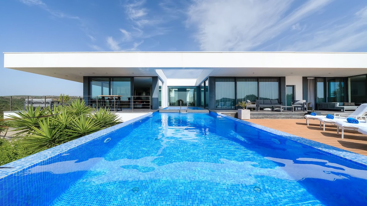 Incredible views stretch out before Vila Mar Azul. As its name, which translates to “blue sea,” suggests, this sleek vacation rental boasts an oceanfront location and the panoramas to match. Use this clifftop retreat as a luxury hideaway in the Algarve, or as a base for a laid-back family holiday in the charming beach town of Salema. The villa’s three levels of living space make the most of its stunning location—and open to outdoor areas where you can soak in the sun. A sparkling pool, loungers, barbecue and al-fresco dining for eight let you entertain or relax from dawn to dusk. After dark, watch the stars come out or step inside to enjoy the satellite TV and Wi-Fi. Vila Mar Azul has one open-plan living area on its main floor, with living and dining areas and a fully equipped kitchen, and a second on its lower level, complete with a second kitchen. A fireplace and plush area rug create a cozy ambience in the main-floor living area; a few steps up, cantilevered chairs add modern style around the dining table. The villa is a short walk from the town of Salema—once a fishing village known for its octopus, now a popular spot for its golden stretch of beach. Slow down to its pace, and you’ll be rewarded with the sight of fishermen hauling in their catch or an afternoon at one of its waterfront restaurants. Golf courses, tennis courts and a spa are a short drive away at Santo Antonio Resort; for more shopping and dining options, drive into Lagos. Copyright © Luxury Retreats. All rights reserved. BEDROOM & BATHROOM • Bedroom 1: Double size bed, Ensuite bathroom with stand-alone rain shower, Office, Ocean view • Bedroom 2: Double size bed, Open ensuite bathroom with stand-alone rain shower & bathtub, Safe, Ocean view • Bedroom 3: Double size bed, Open ensuite bathroom with stand-alone rain shower • Bedroom 4: Double size bed, Ensuite bathroom with stand-alone rain shower, Ocean view • Bedroom 5: Double size bed, Ensuite bathroom with stand-alone rain shower Downstairs Apartment • Bedroom 6: Double size bed, Ensuite bathroom with stand-alone rain shower, Living area, Dining area, Kitchen, Terrace, Ocean view STAFF & SERVICES Included: • Pool cleaning - weekly Extra cost (advance notice may be required): • Yoga sessions • Vila Vita Yacht
