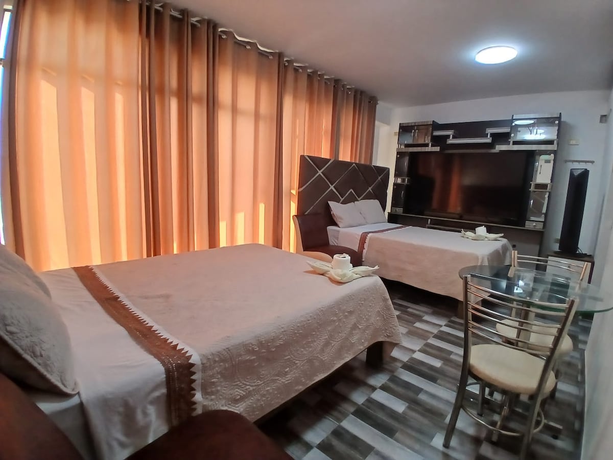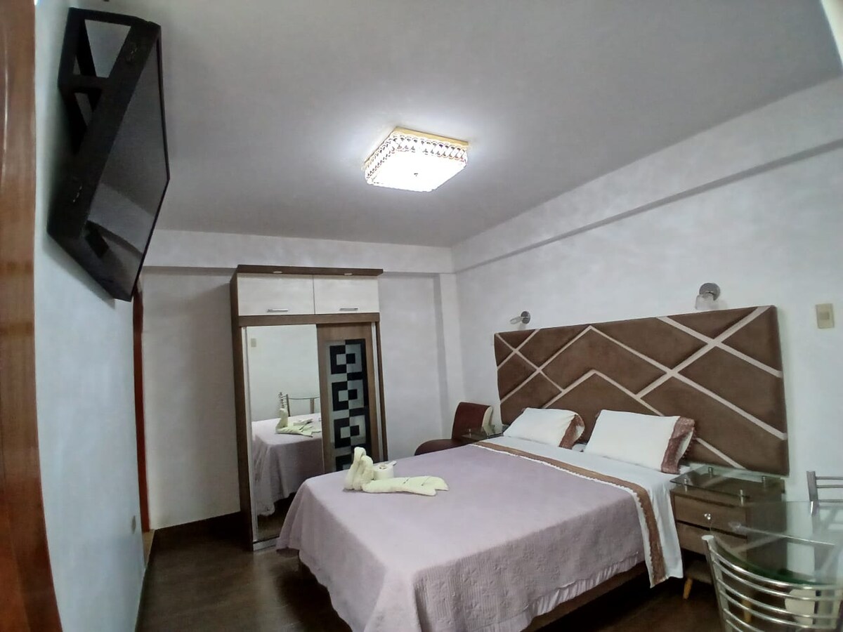 Habitación matrimonial con vista panoramica . cuenta con baño privado, tv cable, wifi, agua caliente. Estamos ubicados cerca de la plaza de armas y el Mercado municipal en mismo churin.