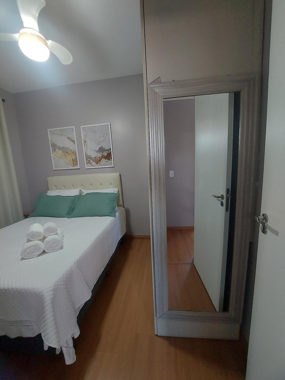 Cozy apartment in a gated community MRV - ideal for 2 people! Two bedrooms (one bed in each), ceiling fan in the living room and in the master bedroom, which also has air conditioning. Everything is clean, well maintained, and well-ventilated. Quiet and wooded condominium, with **parking space** and **recreation area**. Protective grids in the rooms 📍Excellent location 🌿 I welcome guests who take care of the space with affection, as if it were their own. Monthly 📅 rent with fixed amount available. Ask for more information!
