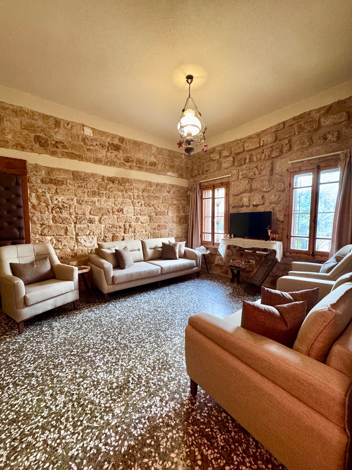 Unwind at this stunning Lebanese old traditional house. The house was lovingly built with natural stone on a solid rock foundation. Enjoy the sea and mountain views from the garden. The house is located in Batroun on a 450 m altitude, a region famous for it’s touristic and natural aspect. The area feels peaceful and at the same time it is only a seven-minute drive away from the beach and the restaurants.
