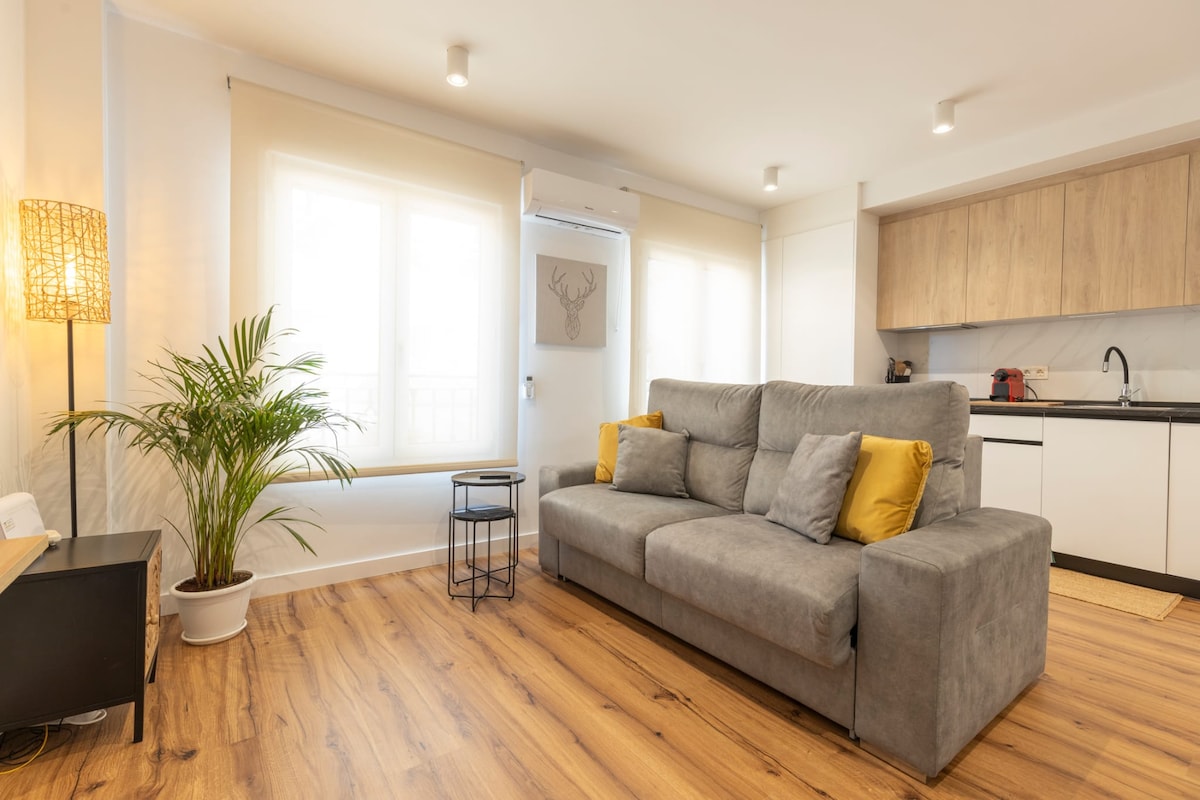 Within the plot of our house we have renovated this beautiful one-bedroom apartment in an open and modern style. The apartment has a separate entrance, kitchen and bathroom, workspace, and a living room that opens to the bedroom. It also has a patio for outdoor living, bright windows, and everything you need to relax It is located in the city belt, easy access by public transport (next to the metro and bus) or car (free parking area)