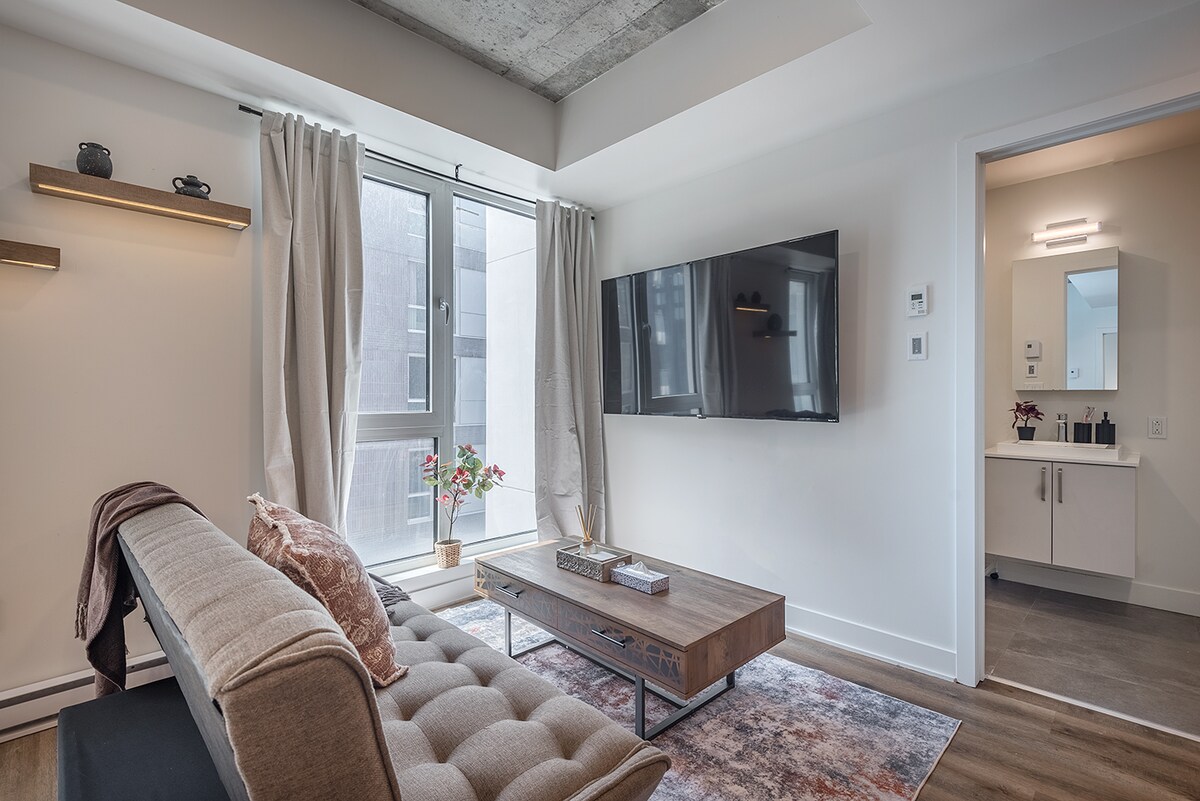 Super new studio, furnished, on the top floor, for rent! 2 steps from St-Laurent metro, UQAM and the Latin Quarter Very well located on St-Catherine Street between Place des Arts and the Village at the intersection of St-Elizabeth Street Fully furnished: bed with mattress, fridge and freezer, oven, dishwasher, microwave, washer and dryer Rooftop terrace, gym and co-working space