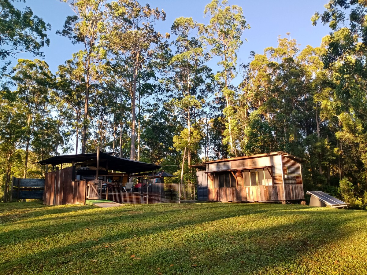 Private, quiet ,quirky with all the right touches of luxury ,our aim is to have you experience what stylish off grid tiny home living can be like. Surrounded by 195 acres or tranquility and designed and built entirely from repurposed materials, everything has a story. Walking tracks and a gorgeous swimming hole just minutes away, or local coffee on the deck taking in the views. 5 minutes to Bellingen town and the space to have friends and family spread out, you can even bring the dog.