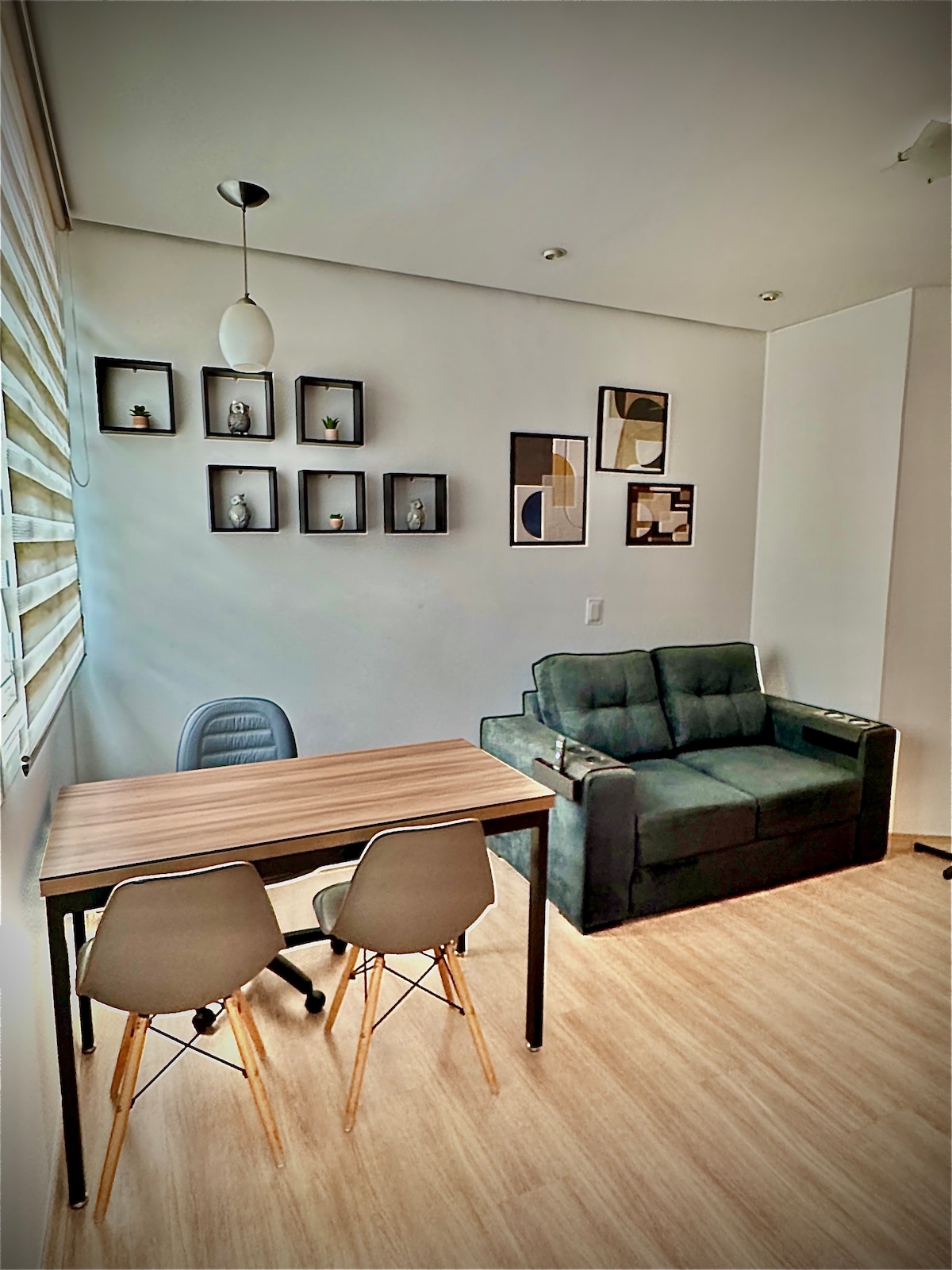 Equipado, SELF CHECK IN e CHECK OUT, fechadura eletrônica, WIFI, ar-condicionado, CAMA QUEEN SIZE, sofá, travesseiros ("da nasa", pluma e espuma), SMARTTV 58", geladeira, MICROONDAS, cooktop, CAFETEIRA, enxoval de primeira linha, utensílios de cozinha. Bem iluminado, poucos ruídos externos, excelente estadia privativa. ESTACIONAMENTO COBERTO, gratuito e com portão eletrônico, RECARREGADOR VEICULAR, academia, LAVANDERIA OMO self-service, coworking, piscina, sauna, portaria eletrônica e câmeras.