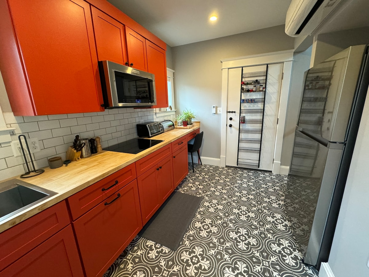 This apartment with its own private entrance sits below our brick Cape Cod-style home. The unit is totally refurbished with luxury amenities. It's a cozy bohemian cottage vibe with a touch of Miyazaki anime magic. Open floorplan includes a fully stocked kitchen with dishwasher (and new Nespresso!) plus a separate sleeping room with comfy king-sized bed and a private bathroom with a large walk-in shower. Off-street parking, fast internet, & sofa bed for extra guests. No smoking inside, please.