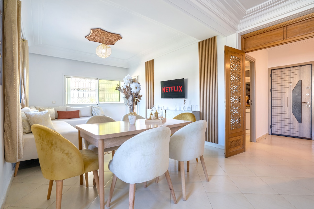 Ilova company is proud to offer this bright and fully equipped appartement on first floor of a quiet &secure neighborhood Mohammedia central. 5 mins drive to serene beaches & steps away from supermarkets, cafés, restaurants, train station, with easy access to major highways. Enjoy a modern living room with traditional Moroccan touch, fully equipped kitchen, balcony, 100 Mbps fiber-optic Wi-Fi, and adedicated workspace, perfect for remote workers. Free and secured parking is available. Book Now
