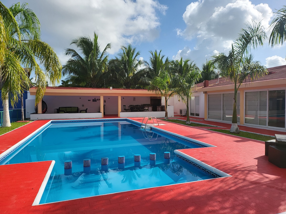 - Piscina privada con calefacción - 5 Recámaras con baño privado - Cine en Casa con pantalla de 120 pulagas - Nintendo Switch con Super Mario Bros - Cocina totalmente equipada - Estacionamiento privado 2 autos - Wi-Fi rápido 300mbps - Terraza con Asador Weber - Comunidad Segura con seguridad 24/7 *** Un traslado desde el aeropuerto GRATIS por estancias de 4 noches o más ***