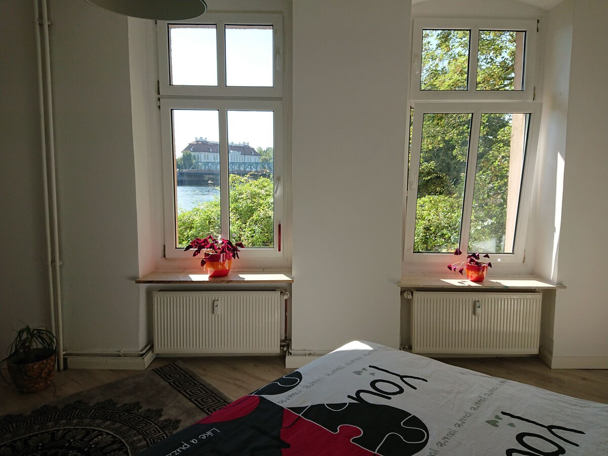 Sunny 4-room apartment with loggia on the water with garden and barbecue corner, swimming in the Dahme or relaxing in the small pool. In the kitchen you will find everything you need for cooking. As well as a kettle and coffee machine. There is a double bed 180 × 200 in the castle room In the Loggia room there are two single beds that can be separated or put together. In the park room is another double bed 180 × 200 As well as two sofa beds, one in the living room facing the garden and one in the loggia. Wi-Fi is everywhere