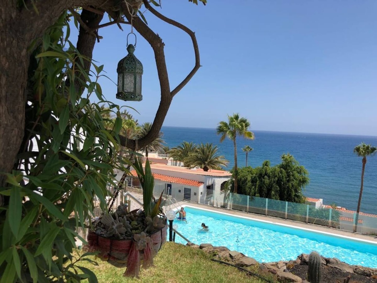 Magnificent Villa for 6 people in Bahía Feliz. It consists of two double bedrooms with an OUTDOOR ANNEX WHERE TWO MORE PEOPLE CAN SLEEP IN SMALL BUNK BEDS. It has an area of 200 m2 with several terraces where you can sunbathe with beautiful ocean views. Two bathrooms and a toilet, separate kitchen, dining room and living room. TV, air conditioning, washing machine, WiFi and outdoor parking included. Ideal for family vacations and very well connected to visit places on the island of Gran Canaria.