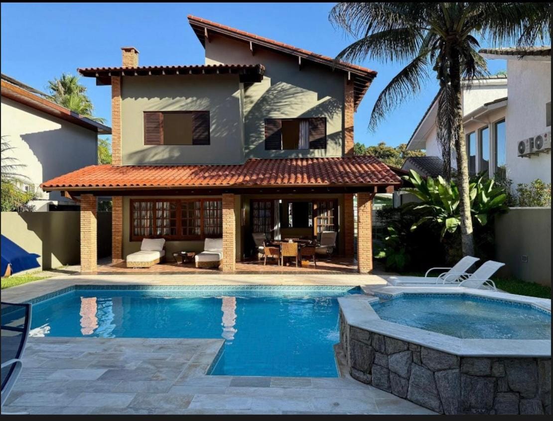 Casa dois andares com infraestrutura completa, apenas 2 minutos a pé da praia. 4 suites com ar condicionado( Uma no térreo ), wi-fi 500mg , Smartv,. Área externa contemplando piscina, Jacuzzi ,churrasqueira, forno de pizza, forno a lenha e mesa ao redor da natureza, redes, lareira na sala, caiaques. Condomínio seguro com reconhecimento facial, rondas 24hs, praia tranquila e vazia, rios. Cozinha completa,2 geladeiras com freezer, freezer na dispensa,máquina de lavar roupa, quartinho.